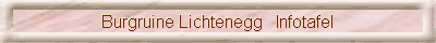Die Infotafel auf der Burgruine Lichtenegg zählt zur Ausstellungsreihe "Natur- und Kulturgeschichte in der Hersbrucker Schweiz" der Gemeinde Pommelsbrunn. Die Lichtenegger Tafel wurde, gleich wie die anderen auf Pommelsbrunner Gebiet auch, aus Mitteln des Naturpark Fränkische Schweiz/ Veldensteiner Forst bezuschusst. Sie gibt in kurzer prägnannter Übersicht Auskunft zur Geschichte der ehemaligen Burg Lichtenegg. Der Entschluss zur Anfertigung auch der Lichtenegger Tafel wurde am 22.04.2002 im Gasthaus Vogel in Pommelsbrunn gefasst. Der damalige Bürgermeister Werner Oberleiter und der Pommelsbrunner Heimatvereinsvorsitzende Ulrich Vogel hatten zu der Besprechung auch den Lichtenegger Gastwirt Hans Raum eingeladen, der sich erfreut zeigte und Unterstützung für das Projekt zusagte. Maßgeblich beteiligt an der inhaltlichen und grafischen Gestaltung der Lichtenegger Infotafel waren neben den auf der Tafel genannten Personen, Hans Seitz, Hans Raum und Rolf Wolfermann. Die Einweihung fand am 12.06.2007 unter Teilnahme von Birgland Bürgermeister Herbert Steinmetz, Pommelsbrunns Bürgermeister Jörg Fritsch, Weigendorfs Bürgermeister Georg Schmid, Illschwangs 2. Bürgermeister Alfred Ebert und Florian Rieder, Geschäftsführer der Zukunftsagentur Plus, statt. Der Einladung von Hans Raum, der den Termin im Auftrag von Bürgermeister Steinmetz arrangiert hatte, gefolgt waren auch die Kreisheimatpfleger des Nürnberger Land Robert Giersch und Werner Sörgel, dazu der Gründungs- u. langjährige Vorsitzende des Förderverein Burgruine Lichtenegg. e.V., Hans Seitz sowie dessen Nachfolger Richard Pilhöfer. Dank gilt insbesondere auch Bürgermeister Herbert Steinmetz, der spontan die finanzielle Unterstützung der Gemeinde Birgland zur Anfertigung des Rahmengestells zugesagt hatte. | |||||||||||||||||||||||||||||||||||||||||||||||||||||||||||||||||||||||||