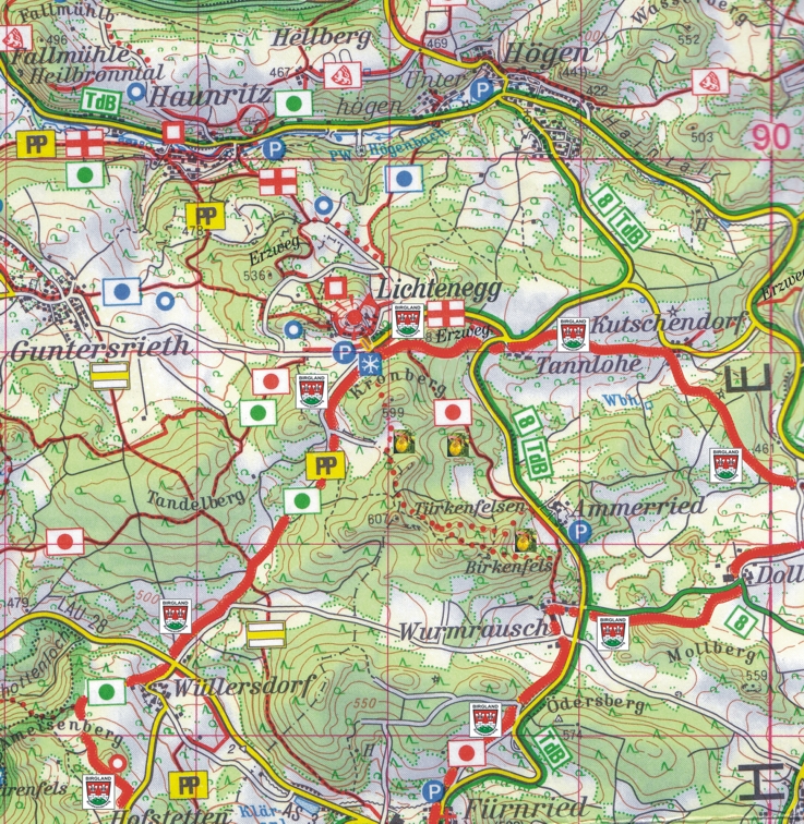 Zauberwald-Orchideen-Weg (Nr. 34) - Beginn am Parkplatz unterhalb des Wirtshauses, führt bergauf, bergab und über Höhenrücken entlang zum Hohen Fels, zu Hänsel u. Gretel, zum Türkenfels. Genusskletterer sprechen hier von einem für Eltern mit Kindern perfekten Klettergebiet in idyllischer Landschaft. Viele Touren, zu denen auch Beschreibungen vorhanden sind, wurden in den letzten Jahren saniert. Der Orchideenweg führt nicht nur am Frauenschuh (Blütezeit zweite Mai- bis erste Junihälfte) vorbei, sondern an rund zwanzig weiteren Orchideenarten, die den Sommer über zahlreich blühen, darunter die Kuckucksblume, der Fliegenragwurz, der Nestwurz. Orchideen kann man natürlich auch an anderen Standorten bei Lichtenegg entdecken. Außerdem begegnen dem Wanderer und Spaziergänger um Lichtenegg herum Salomonsiegel, Küchenschellen, Berganemonen, Schlüsselblumen, Margareten und andere seltene Pflanzen mehr. Dazu Mystik Wald, urtümlich und in Vielzahl, beinah exotisch anmutend. Ist der Wanderer über das berüchtigte Fleckchen Magische Erde" - ein alteingesessener Revierjäger fand an einem späten nebligen Herbstabend nicht mehr weg, etliche Jahre später, im Mai 2003 : eine Frau schien zu schweben, verschwand und tauchte im nahen Lichtenegg wieder auf - heil hinweggekommen, steht ihm frei, die Abkürzung Richtung Ammerried oder den alpinen" Abstieg nahe gen Wurmrausch zu wählen. Beide Male führt ihn die Markierung nach 1 ½ bis 2 Stunden Gehzeit und 4 bis 5 Kilometer Wegstrecke am Labyrinth der Gnomen und Elfen vorbei zurück nach Lichtenegg. Man muss allerdings schon sehr aufmerksam hineinhören in den Wald und genau hinsehen, um die graziösen kleinen Feen bei deren Tanz auf der Wiese der Waldlichtung wahrzunehmen. Die Kobolde hingegen hat schon so mancher Wanderer zu spüren bekommen, der urplötzlich über einen Baumstumpf stolperte, der Sekunden zuvor garantiert nicht im Wege stand. Geeignetes Schuhwerk und zumindest ein klein wenig geübter Tritt auf mitunter steil ansteigenden bzw. abfallenden Wanderpfaden auf Höhenlagen zwischen 500 und 600 Meter sind hier vonnöten. | ||||||||||||||||||||||||||||||||||||||||||||||||||||||||||||||||||||||||||||||||||||||