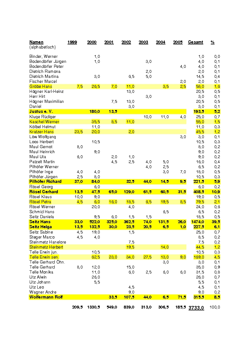 Arbeitseinsätze - nicht immer leicht Ein Großteil der Burgruine Lichtenegg konnte in den Jahren von 1999 bis 2005 in 3 Bauabschnitten saniert werden. Dieser Erfolg war nur möglich, weil viele freiwillige Helfer tatkräftig mitgearbeitet haben. Neben Zuschüssen und Spenden waren diese Eigenleistungen des Fördervereins ein wichtiger Beitrag zur Gesamtfinanzierung. Die genannten Eigenleistungen umfassten zunächst die Entbuschung des zugewachsenen Burgbergs. Dann folgten Verlegungen von Strom- und Wasserleitungen, Installation dreier Scheinwerfer, Aufstellung eines Fahnenmasts, Anlegen von Wegen, Einbau von Drainagen, Freilegung von Mauer- und Fundamentresten, Reinigung verwitterter Mauerfugen sowie Bereitstellung von Steinen als Baumaterial. Am mühsamsten war die jahrelange Ausgrabung des Innenbereichs der Burgruine und das Abfahren einer bis zu 4 m hohen sorgfältig nach Funden durchgesiebten Schuttschicht. Dazu kamen immer wieder erforderliche Aufräumarbeiten. Insgesamt fielen alleine bis 2005 über 3700 freiwillig und kostenlos geleistete Arbeitsstunden an. Die nachfolgend genannten Helfer opferten für diese zuweilen sehr mühevollen Arbeiten ihre Freizeit und so manche Urlaubstage! Die Burgsanierung kam in diesem Zeitraum zügig voran. Von 1999 bis 2005 geleistete freiwilligen und kostenlosen Arbeitsstunden: (ohne Arbeiten für die Burgfeste und ohne die geleisteten ungezählten Stunden für Büro- und PC-Arbeit, Vereinsnachrichten, Homepage, Korrespondenz, Telefonate und Behördenbesuche) |