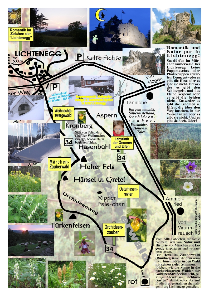 Es war im März 2001. Mein damals noch kleiner, sechsjähriger Sohn Hansi und ich, dazu das Pony Bella, wir drei haben den Märchen-Zauberwald "entdeckt". Sie dürfen im Märchenzauberwald bei Lichtenegg keine Pappmaschee- oder Plastikpuppen erwarten. Das wäre zu plump und der wirklich schöne, beinah unberührte Wald viel zu schade dafür. Sie oder auch Ihre Kinder sollen hier in Lichtenegg zurückfinden zur Natur. Abschalten, den Alltagsstress hinter sich lassen, hineinhören in den Wald mit seinen vielen Stimmen. Wie gesagt, mit Klein-Hansi und Pony Bella bin ich den Rundweg Nummer 34 gegangen. Hansi sah den Wald als "seinen Märchen-Zauberwald". Damals im zeitigen Frühjahr. Die letzten Schneereste lagen im Waldschatten, doch es roch unverkennbar nach Frühling... Mit ein bisschen Fantasie werden Sie all das sehen und empfinden, wie das Hansi auch vernommen hat. Seine Eindrücke sind untenstehend wiedergegeben. Hans Raum |