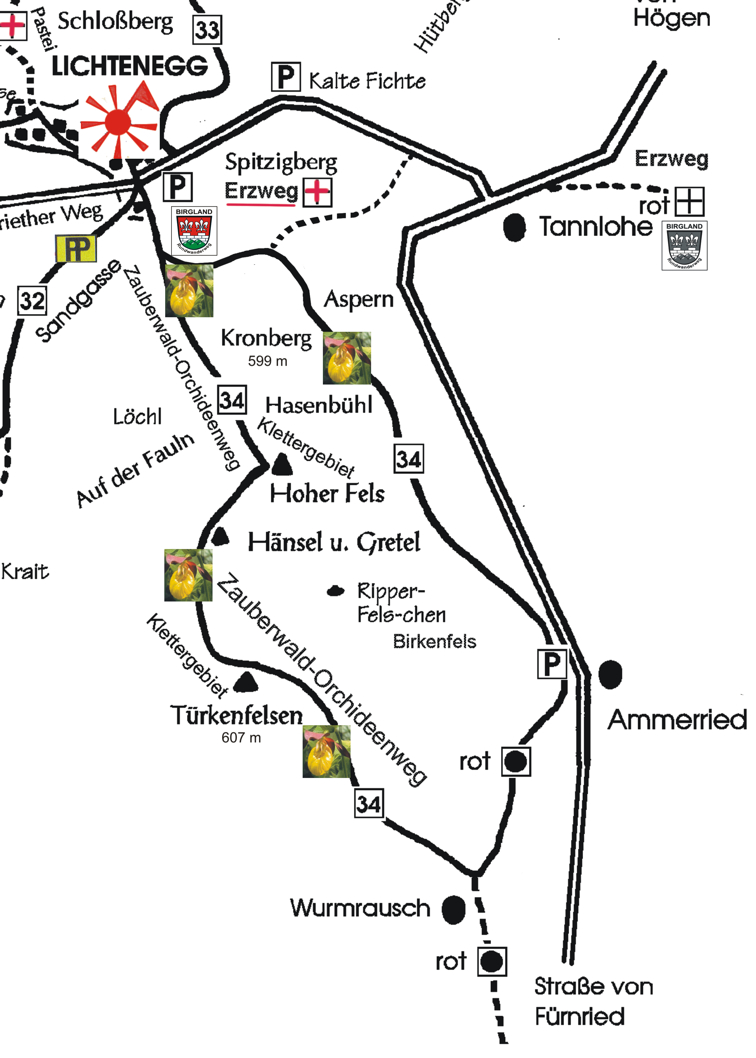 Zauberwald-Orchideen-Weg (Nr. 34) - Beginn am Parkplatz unterhalb des Wirtshauses, führt bergauf, bergab und über Höhenrücken entlang zum Hohen Fels, zu Hänsel u. Gretel, zum Türkenfels. Genusskletterer sprechen hier von einem für Eltern mit Kindern perfekten Klettergebiet in idyllischer Landschaft. Viele Touren, zu denen auch Beschreibungen vorhanden sind, wurden in den letzten Jahren saniert. Der Orchideenweg führt nicht nur am Frauenschuh (Blütezeit zweite Mai- bis erste Junihälfte) vorbei, sondern an rund zwanzig weiteren Orchideenarten, die den Sommer über zahlreich blühen, darunter die Kuckucksblume, der Fliegenragwurz, der Nestwurz. Orchideen kann man natürlich auch an anderen Standorten bei Lichtenegg entdecken. Außerdem begegnen dem Wanderer und Spaziergänger um Lichtenegg herum Salomonsiegel, Küchenschellen, Berganemonen, Schlüsselblumen, Margareten und andere seltene Pflanzen mehr. Dazu Mystik Wald, urtümlich und in Vielzahl, beinah exotisch anmutend. Ist der Wanderer über das berüchtigte Fleckchen Magische Erde" - ein alteingesessener Revierjäger fand an einem späten nebligen Herbstabend nicht mehr weg, etliche Jahre später, im Mai 2003 : eine Frau schien zu schweben, verschwand und tauchte im nahen Lichtenegg wieder auf - heil hinweggekommen, steht ihm frei, die Abkürzung Richtung Ammerried oder den alpinen" Abstieg nahe gen Wurmrausch zu wählen. Beide Male führt ihn die Markierung nach 1 ½ bis 2 Stunden Gehzeit und 4 bis 5 Kilometer Wegstrecke am Labyrinth der Gnomen und Elfen vorbei zurück nach Lichtenegg. Man muss allerdings schon sehr aufmerksam hineinhören in den Wald und genau hinsehen, um die graziösen kleinen Feen bei deren Tanz auf der Wiese der Waldlichtung wahrzunehmen. Die Kobolde hingegen hat schon so mancher Wanderer zu spüren bekommen, der urplötzlich über einen Baumstumpf stolperte, der Sekunden zuvor garantiert nicht im Wege stand. Geeignetes Schuhwerk und zumindest ein klein wenig geübter Tritt auf mitunter steil ansteigenden bzw. abfallenden Wanderpfaden auf Höhenlagen zwischen 500 und 600 Meter sind hier vonnöten. | ||||||||||||||||||||||||||||||||||||||||||||||||||||||||||||||||||||||||||||||||||||||
