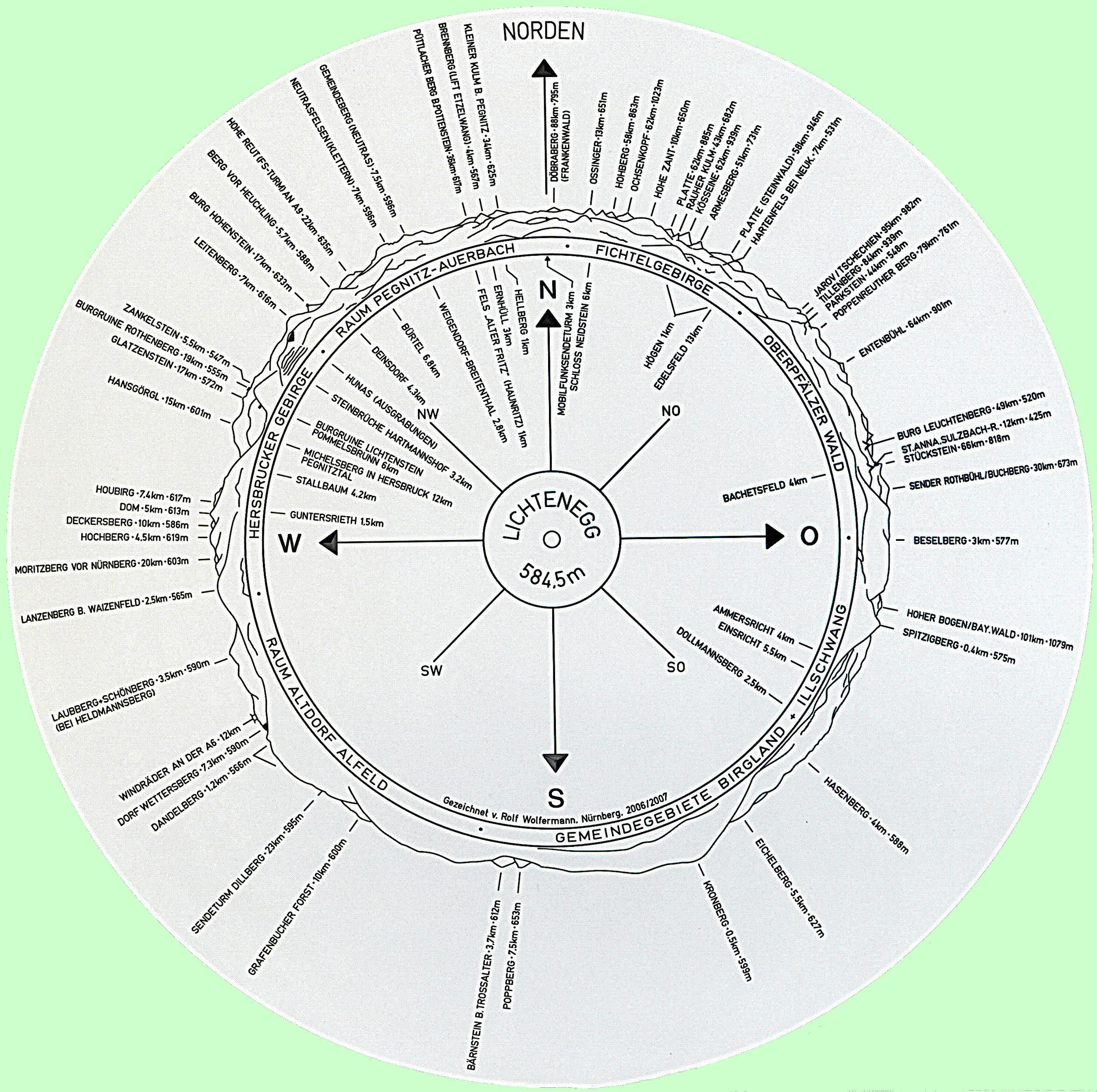 Mai-Wochenende 23./24.05.2008 Einer der "Freunde Lichteneggs" freut sich beim Mittagessen im Lichtenegger Wirtshaus: "Die Panoramatafel ist montiert. Groß und Klein, Alt und Jung aus Nah und Fern finden das prima!" War's eine Ente? Macht nichts, im Wirthaus direkt unterhalb der Burgruine bekommen Sie die Grafik, anhand derer Sie oben auf dem Gipfel die Nah- und Fernziele bestimmen können, auf Papier gedruckt. 24.06.2008 Die Panoramatafel ist montiert. Die Gäste der Wirtsfamilie Raum - Pensionsgäste aus dem Hessischen - zählen zu den ersten Betrachtern. Ein bisschen nachjustiert werden müsse noch, wird ihnen erklärt, fünf Millimeter, damit die Zielrichtung auch wirklich stimme. Im Wirtshaus sind viele lobende Stimmen dazu zu vernehmen. Den Seitz Hans, der zusammen mit dem Bürgermeister Herbert Steinmetz den Sockel aufgemauert hat und den Wirt Hans Raum, der sich an vorderer Stelle mit für den Zufluss der Fördergelder eingesetzt hatte, freut das natürlich auch ganz besonders. Private Spender kommen aus den Reihen der Mitglieder des Fördervereins. Hier sind Sie mit einem Klick beim Gipfel-Panorama. | |||||||||||||||||||||||||||||||||||||||||||||||||||||||||||||||||||||||||||||||||||||||||||||||||